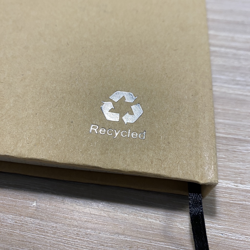 Taccuino formato A5 rilegato con copertina rigida in cartone riciclato.